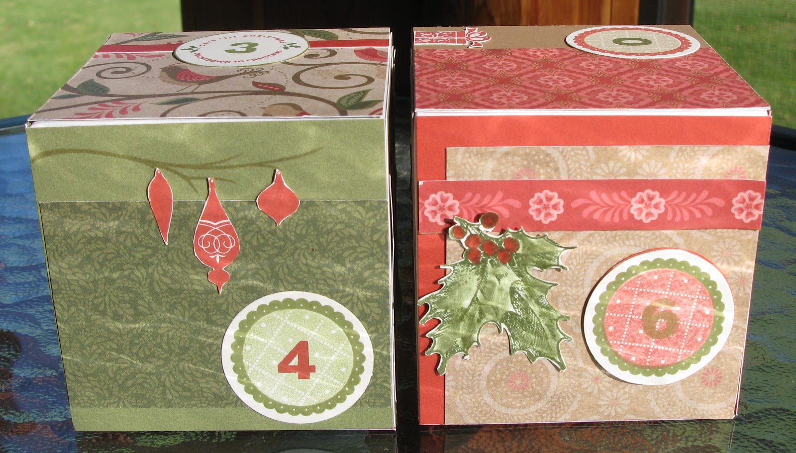 I used 2 My Creations blocks to make these Countdown to Christmas blocks. I used Pear and Partridge paper to cover and embellish the 3 inch sides. The numbers come from the Countdown stamp set. Other stamps are from the Card workshop and Christmas Joy stamp sets.